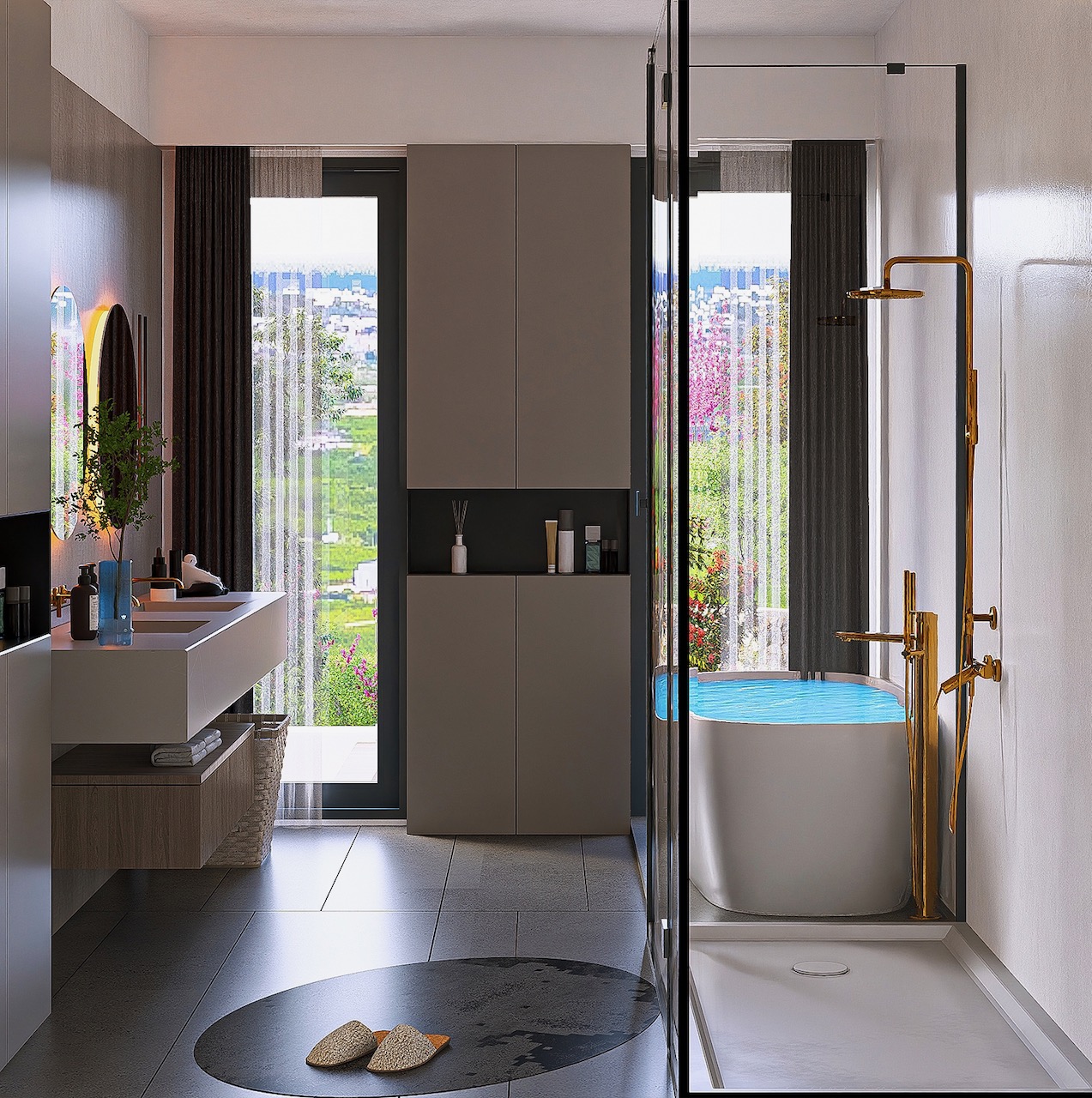 Une deuxième chambre dispose de son propre dressing, d'une salle de bains privative et d'une terrasse privée avec une vue magnifique, tandis que la troisième chambre bénéficie également de sa propre salle de bains privative.