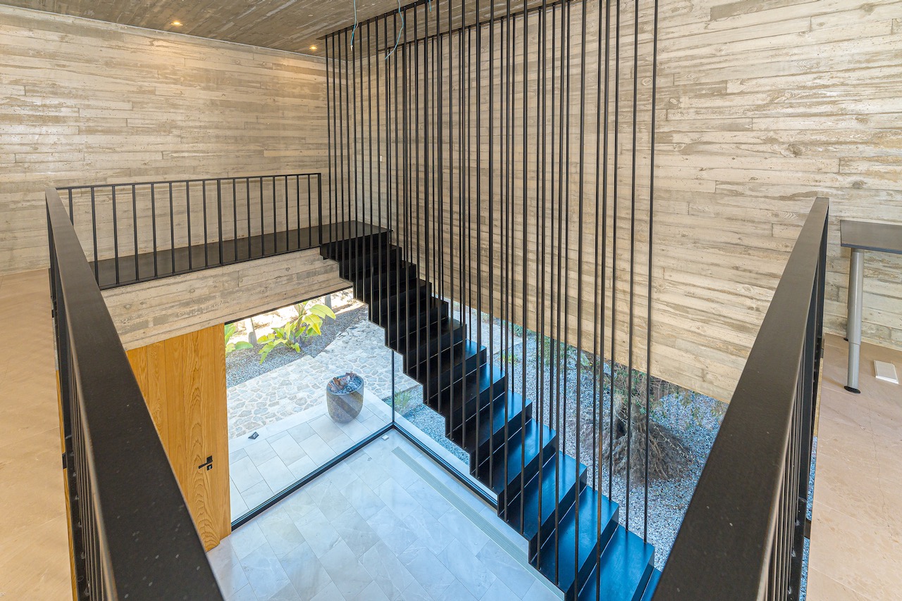 L’escalier minimaliste relie les niveaux et les grandes baies vitrées ouvrent sur la terrasse avec piscine, cuisine extérieure et zones de détente.