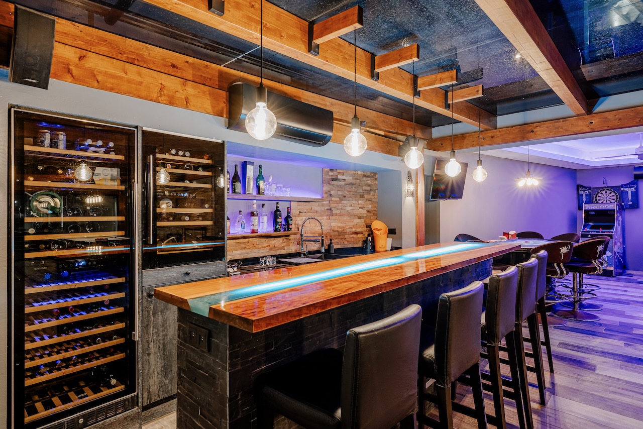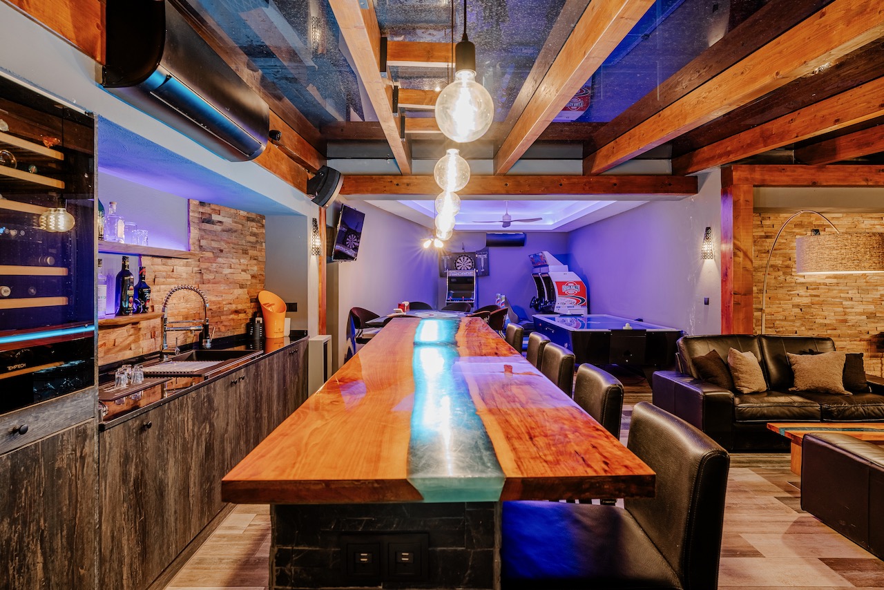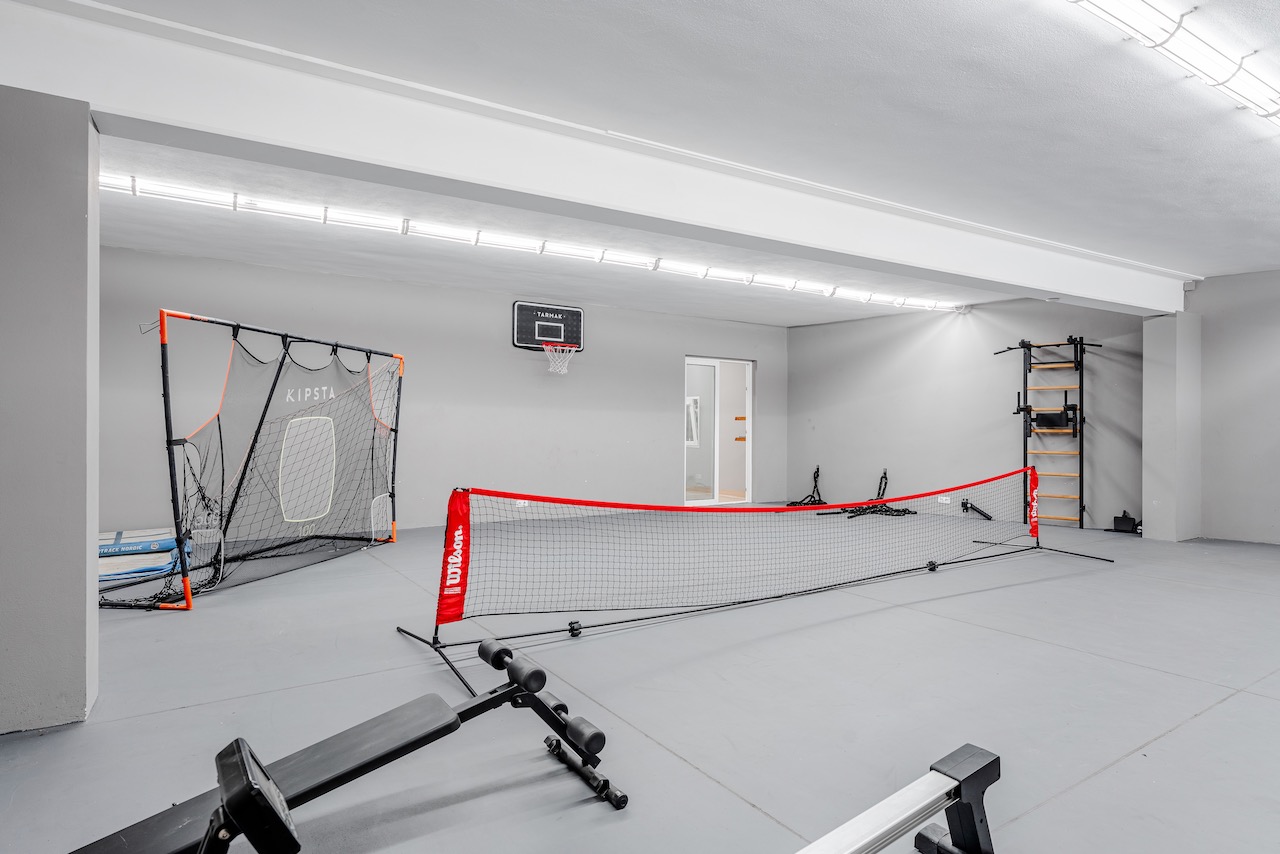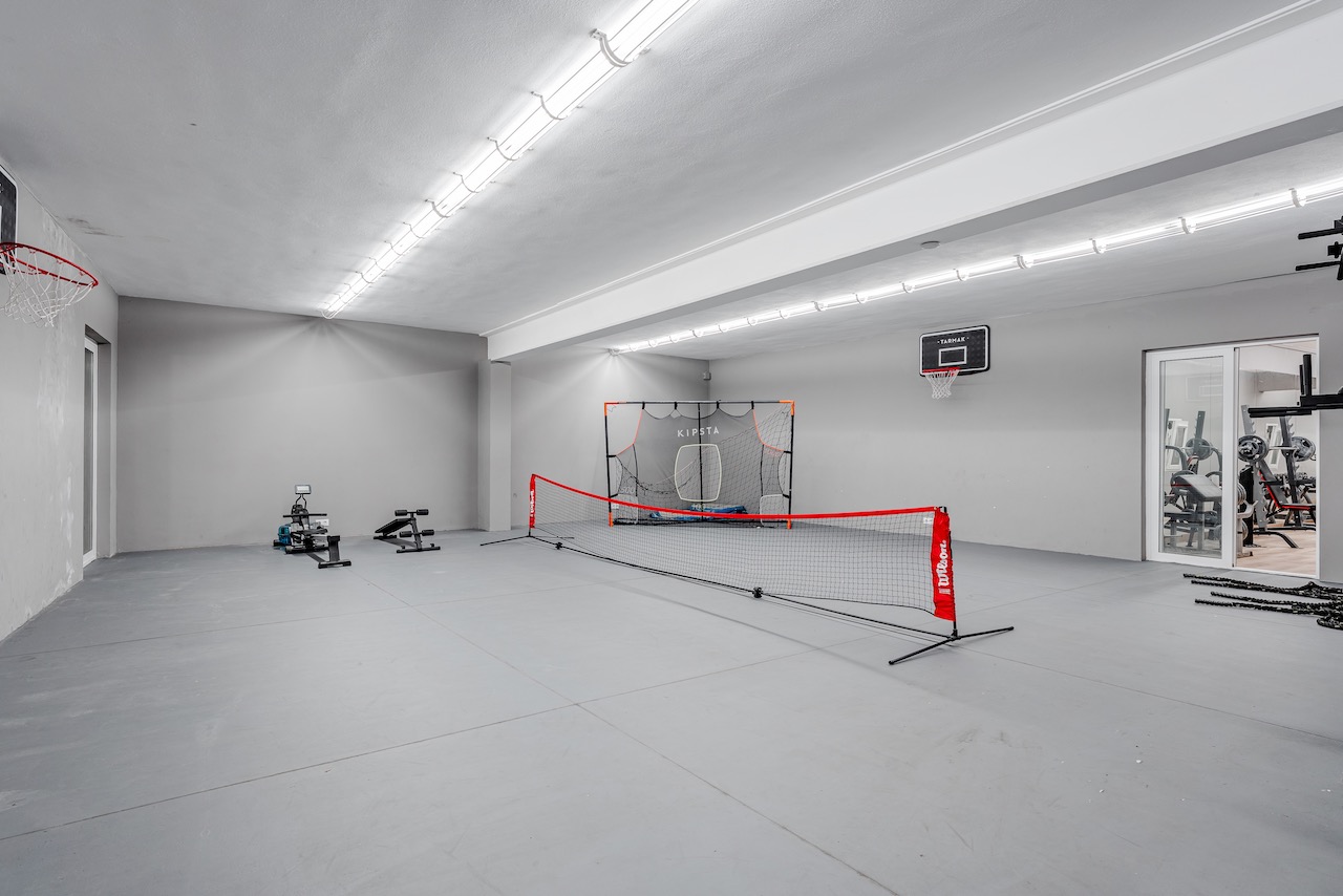 A private underground sports hall with a gym and basketball area adds a unique element to the home.