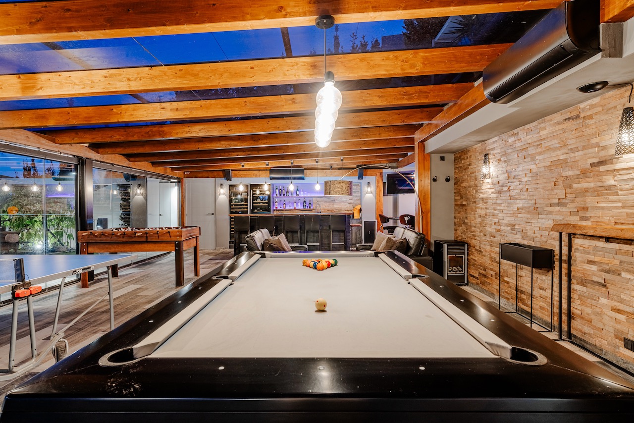 The property also includes a large entertainment lounge with games area and surround sound, designed to connect seamlessly with the outdoor spaces and sea views.